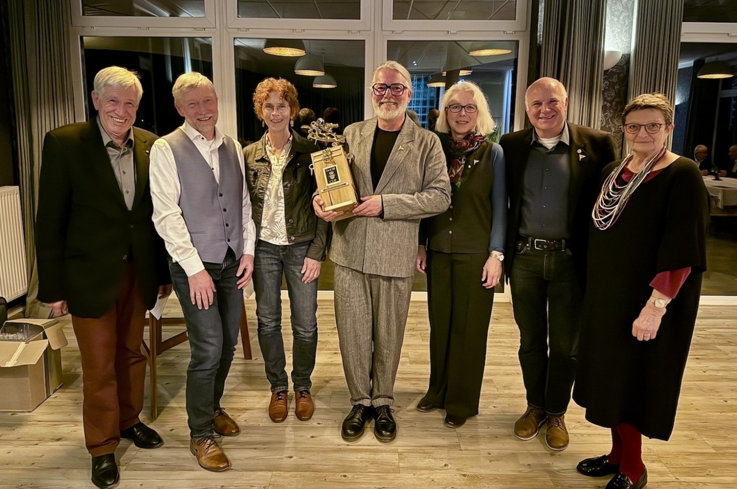 Und aus dieser Perspektive möchte ich dem PYC auch für das grandiose Geschenk danken, das Hilkka Kirstaedter in kürzester Zeit erdacht, geplant und gestaltet hat: einen (dauerhaften!) Wanderpokal, den der FYP fortan für die Gewinner des Goor-Cups vergeben kann. Alles an diesem wirklich ganz besonderen Stück hat eine Bedeutung: von dem Holz, das sowohl für die Fischerhütte als auch für das namensgebende ufernahe Waldgebiet „Goor“ steht, über die Risse im Holz, die wie die Blitze anmuten, die im Juli 1925 den Geräteschuppen der Fischer zerstörten, bis hin zu Anbinderingen, die an diesem Dalben in alle vier Himmelsrichtungen Freunde zum Festmachen einladen sollen. Gekrönt wird der Pokal von einem (funktionsfähigen!) Sextanten. Schließlich handelt es sich um eine Trophäe von Seefahrern für Seefahrer. Er ist richtungsweisend, auch über große Entfernungen, wie Lauterbach-Berlin, und das sowohl räumlich als auch über lange Zeiträume. Er befähigt zur eigenständigen Navigation und damit auch zur Umschiffung möglicher Hindernisse. Eine kleine Plakette des stiftenden historisch und heute wieder freundschaftlich verbundenen PYC rundet das Kunstwerk ab.
