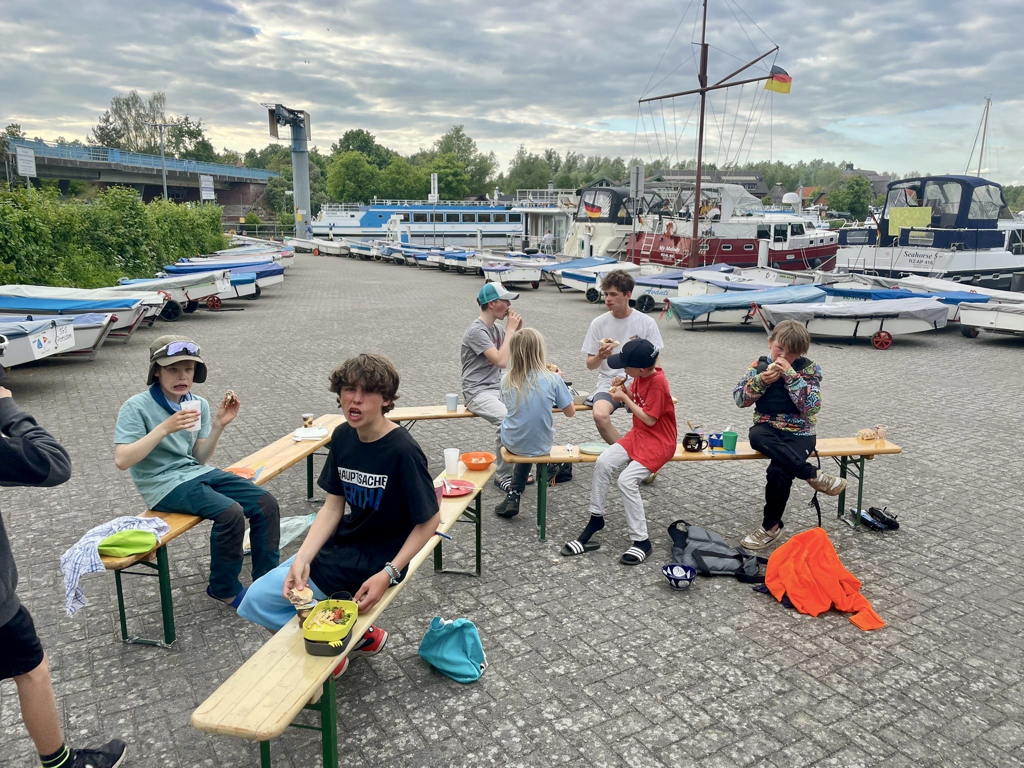 Am Donnerstag gab es ein schmackhaftes und umfangreiches Frühstücksbüffet (wie im Hotel - danke an Christine!!) und gestärkt wurden wir rausgeschleppt. In Plau muss man immer erst einen idyllischen Kanal entlang geschleppt werden bevor man auf dem See ist. Bei wenig Wind haben wir trainiert und nach einer Mittagspause auf dem Wasser gab es ein Trainingsrennen mit den anderen Berliner Vereinen. Der Wind war dabei leider eher wenig. Im Gegensatz zu Freitag: da hatten wir teilweise richtig guten „Hängewind.“ Am Abend wurden Würstchen gegrillt und wir konnten Angeln, Fussball spielen oder mit ferngesteuerten Motorbooten im Hafen fahren. Einmal musste unser Trainer Sander ins Wasser springen, um unseren Fußball zu retten.