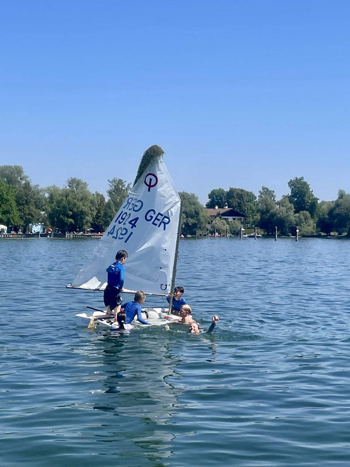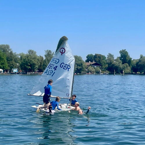 Die Bronzefleet schaffte gerade noch ein Rennen auf dem Innerloop während die Rennen der Silber- und Gold-Fleet auf dem Outerloop aus Windmangel abgebrochen werden mussten. Um 12:30 Uhr kam dann der finale Abbruch. Bei Windstille und bestem Sommerwetter fuhren noch mal alle raus, die auf der Deutschen ihre letzte Regatta im Opti gesegelt sind und nun in eine andere Bootsklasse umsteigen. Wir haben Immos Opti durchgekentert, uns hinterm Mobo herziehen lassen und die anderen nassgespritzt. Das war sehr emotional; da wir eine so tolle Gruppe sind, fällt der Abschied besonders schwer und ist traurig.